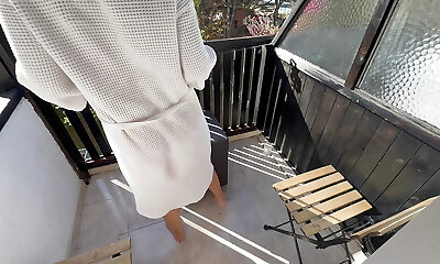 Fucked Her on the balcony in front of residential buildings and a busy road, Jizz Shot On Her Arse