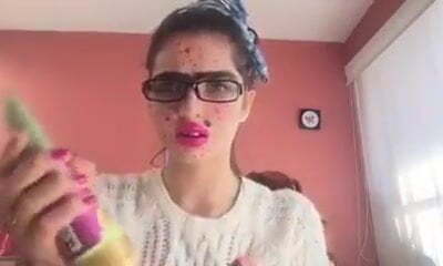 Four eyed red haired bitch with ugly saggy mammories used banana to show off uber-cute solo at kitchen